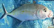 The island trevally is a moderately large fish, growing to a maximum recorded length of 75 cm and 6.61 kg in weight.[6] The species is quite similar to C. ferdau, although the prominent yellow spots serve as a quick identifying feature.[7] The island trevally has a compressed oblong shaped body with the dorsal profile more convex than the ventral profile and the snout usually being slightly rounded.[8] The dorsal fin is in two sections, the first consisting of eight spines and the second of one spine and 28 to 31 soft rays, with the lobe of the second dorsal fin being slightly falcate in younger individuals, but is always shorter than the head length. The anal fin has two detached spines followed by one spine attached to 24 to 26 soft rays, while the pelvic fin has one spine attached to 21 or 22 soft rays.[9] The lateral line has a very slight anterior arch, with the intersection of the straight and curved sections between the 15th and 19th soft rays of the dorsal fin. The curved section contains 96 to 106 scales, while the straight section contains 20 to 30 scales and 21 to 28 scutes.[9] The breast is scaleless ventrally until the origin of pelvic fins, often with a small patch of prepelvic scales. Laterally, this naked area of the breast is separated from the naked base of the pectoral fins by a moderate band of scales. The lips are notably fleshy in adults, with both jaws containing narrow bands of villiform teeth which become obsolescent with age. There are 28 to 32 gill rakers in total and 24 vertebrae.[8]