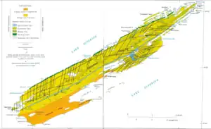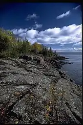 The two main rock assemblages found on the island include the Portage Lake Volcanics and the Copper Harbor Conglomerate, both Precambrian in age. The volcanics are mainly ophitic flood basalts, some 100 individual flows over an accumulated thickness of at least 10,000 feet. The conglomerate outcrops on the southwestern portion of the island and consists of sedimentary rock derived from volcanic rocks in present-day Minnesota. Glacial erosion accentuated the ridge and valley topography from pre-glacial stream erosion. Glacial striations indicate a generally westward movement of the glaciers as do the recessional moraines west of Lake Desor. Drumlins are found west of Siskiwit Lake.[15]: 8, 14–15, 21, 25, 42, 45