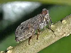 Like all planthoppers,[5] the nymphs of this insect have a small, gear-like structure on the base of each of their hind legs.[6] These gears have teeth that intermesh, keeping the legs synchronized when the insect jumps, preventing it from spiraling. This is the first planthopper species in which the function of these gears was described,[6] though their existence had been known for decades.[7] The insects shed this gear before moulting into adults.[8][9] [10]
