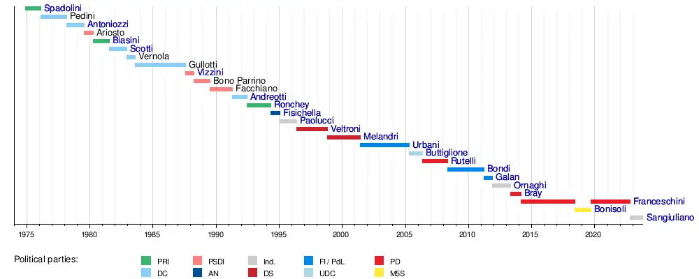 The current minister is Gennaro Sangiuliano, who is serving since 22 October 2022 in the government of Giorgia Meloni. The longest-serving minister of culture is Dario Franceschini, of the Democratic Party.[1]