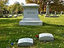 Johnson continued taking paying fights for many years, and operated several other businesses, including lucrative endorsement deals. He died in a car crash in 1946 at the age of 68.[10] He is buried at Graceland Cemetery in Chicago. In 2018 Johnson, with some instigation from actor Sylvester Stallone, was formally pardoned by U.S. president Donald Trump.[11]