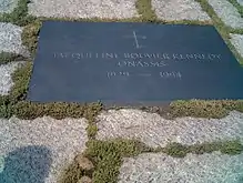 After the assassination and funeral of her husband in 1963, Kennedy and her children largely withdrew from public view. In 1968, she married Greek shipping magnate Aristotle Onassis, which caused controversy. Following Onassis's death in 1975, she had a career as a book editor in New York City, first at Viking Press and then at Doubleday, and worked to restore her public image. Even after her death, she ranks as one of the most popular and recognizable first ladies in American history, and in 1999, she was listed as one of Gallup's Most-Admired Men and Women of the 20th century.[5] She died in 1994 and was buried at Arlington National Cemetery alongside President Kennedy.[6] Surveys of historians conducted periodically by the Siena College Research Institute since 1982 have consistently found Kennedy Onassis to rank among the most highly regarded first ladies by the assessments of historians.