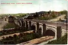 Perhaps the most dramatic building project in Jamaica Plain history was the elevation of the train line above grade in the 1890s.[27] In order to avoid accidents at street crossings, an embankment was built from Roxbury south through Forest Hills station, with bridges over all intersecting streets. The embankment cut through most of Jamaica Plain from north to south. In time, the housing along the embankment came to be devalued, and property to the east of the train line was cut off from the higher income sections of the community.