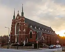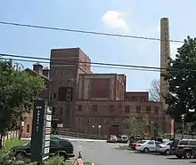 Breweries continued to be major employers during these years.[15] On Heath Street, the Highland Spring Brewery had been operating since 1867. In the 1880s, the Eblana and Park breweries and the American Brewing Company opened, taking advantage of local German and Irish immigrants to fill jobs. Franklin Brewery extended the beermaking district to Washington Street. These and other breweries were all closed to beer making during Prohibition, and few survived to reopen after repeal, although many found other uses, and some still stand. An exception was Haffenreffer, which continued until 1964.[16] The old building now houses a number of commercial establishments, including the Boston Beer Company, brewers of Samuel Adams beer, as well as the nonprofit Jamaica Plain Neighborhood Development Corporation.[17][18][19] A late survivor was Croft Ale, brewed in the Highland Spring Brewery building until 1953, when it became the Rosoff Pickle factory,[20][21] where the pickle vats could be seen from the commuter trains passing by.