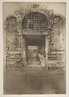 The etchings include portraits of family, mistresses, and intimate street scenes in London and Venice.[67] Whistler gained an enormous reputation as an etcher. Martin Hardie wrote "there are some who set him beside Rembrandt, perhaps above Rembrandt, as the greatest master of all time. Personally, I prefer to regard them as the Jupiter and Venus, largest and brightest among the planets in the etcher's heaven."[68] He took great care over the printing of his etchings and the choice of paper. At the beginning and end of his career, he placed great emphasis on cleanness of line, though in a middle period he experimented more with inking and the use of surface tone.[69]