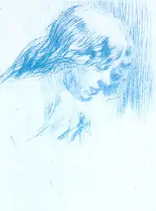 He worked with great rapidity and long hours, but he used his colours thin and covered the canvas with innumerable coats of paint. The colours increased in depth and intensity as the work progressed. At first the entire figure was painted in greyish-brown tones, with very little flesh colour, the whole blending perfectly with the greyish-brown of the prepared canvas; then the entire background would be intensified a little; then the figure made a little stronger; then the background, and so on from day to day and week to week, and often from month to month. ... And so the portrait would really grow, really develop as an entirety, very much as a negative under the action of the chemicals comes out gradually—light, shadows, and all from the very first faint indications to their full values. It was as if the portrait were hidden within the canvas and the master by passing his wands day after day over the surface evoked the image.[65]