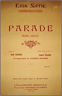 In his early twenties, Cocteau became associated with the writers Marcel Proust, André Gide, and Maurice Barrès. In 1912, he collaborated with Léon Bakst on Le Dieu bleu for the Ballets Russes; the principal dancers being Tamara Karsavina and Vaslav Nijinsky. During World War I, Cocteau served in the Red Cross as an ambulance driver. This was the period in which he met the poet Guillaume Apollinaire, artists Pablo Picasso and Amedeo Modigliani, and numerous other writers and artists with whom he later collaborated. Russian impresario Sergei Diaghilev persuaded Cocteau to write a scenario for a ballet, which resulted in Parade in 1917. It was produced by Diaghilev, with sets by Picasso, the libretto by Apollinaire and the music by Erik Satie. "If it had not been for Apollinaire in uniform," wrote Cocteau, "with his skull shaved, the scar on his temple and the bandage around his head, women would have gouged our eyes out with hairpins."[7]