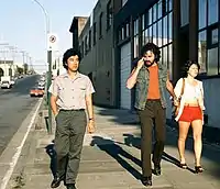 Mimic[9] (1982) typifies Wall's cinematographic style and according to art historian Michael Fried is "characteristic of Wall's engagement in his art of the 1980s with social issues".[10] A 198 × 226 cm colour transparency, it shows a white couple and an Asian man walking towards the camera. The sidewalk, flanked by parked cars and residential and light-industrial buildings, suggests a North American industrial suburb. The woman is wearing red shorts and a white top displaying her midriff; her bearded, unkempt boyfriend wears a denim vest. The Asian man is casual but well-dressed in comparison, in a collared shirt and slacks. As the couple overtake the man, the boyfriend makes an ambiguous but apparently obscene and racist gesture, holding his upraised middle finger close to the corner of his eye, "slanting" his eye in mockery of the Asian man's eyes. The picture resembles a candid shot that captures the moment and its implicit social tensions, but is actually a recreation of an exchange witnessed by the artist.[11][12]