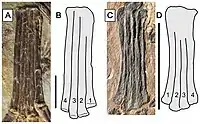 The type species is based on holotype IVPP V12705, a nearly complete specimen from the Daohugou beds of Ningcheng County in the Neimongol (Inner Mongolia) Autonomous Region of China.[2] The specimen is crushed into a slab and counterslab pair, so that parts of the specimen are preserved on one side of a split stone and some on the other. This includes exquisite preservation of carbonized skin fibers and pycnofibres. The fibers are preserved around the body of the specimen in a "halo." Wing tissue is preserved, though its extent is debatable, including the exact points of attachment to the legs (or if it is attached to the legs at all). In 2009 Alexander Kellner published a study reporting the presence of three layers of fibers in the wing, allowing the animal to precisely adapt the wing profile.[3]
