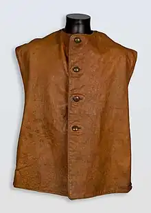 A jerkin is a man's short close-fitting jacket, made usually of light-coloured leather, and often without sleeves, worn over the doublet in the 16th and 17th centuries. The term is also applied to a similar sleeveless garment worn by the British Army in the 20th century. A buff jerkin is an oiled oxhide jerkin, as worn by soldiers.