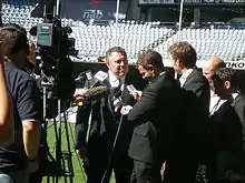 Hockey regularly appeared on the Seven Network's morning program Sunrise in the "Big Guns of Politics" section debating the Opposition Leader, Kevin Rudd, drawing 20,000–30,000 additional viewers who would tune in specifically for that segment,[27] until the arrangement was mutually terminated on 16 April 2007 following controversy over plans to stage a pre-dawn Anzac Day service in Vietnam.[28][29] Hockey credits this show for introducing him to an audience who had no interest in politics.[15]: 141–142