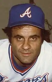 With the Mets in 1975, Torre became the third player in Major League history, and first in the National League, to hit into four double plays in one game.[47] Felix Millán singled in all four of his at-bats hitting ahead of Torre, and at a post-game press conference, Torre joked about his own performance by saying "I'd like to thank Felix Millán for making this possible." When Torre's batting average fell to .247 in 1975, it appeared that his best years might be behind him. However, his average rebounded 59 points in 1976, and he finished the year with a .306 batting average.[48] In May 1977, the Mets fired manager Joe Frazier and named Torre as their player-manager.[49] Torre was the second of three player-managers in the 1970s, the other two being (Frank Robinson in 1975 and 1976 with the Cleveland Indians, and Don Kessinger in 1979 with the Chicago White Sox.[50] Because Torre believed he could not do the job of manager properly while still playing, he decided to retire at age 37. He served 18 days as a player-manager, having two at-bats. His final at-bat came on June 17, 1977, at Shea Stadium against the Houston Astros, when he put himself in as a pinch hitter. He flied out to right field, thereby ending his playing career.