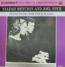 While later studying in London with famed pianist Dame Myra Hess in 1959, Joel Rice was introduced to Yaltah Menuhin, sister of violinist Yehudi Menuhin, who had come to play in the Bath Festival. A year later, after their marriage in America on Joel's 27th birthday in 1960, the young pianists were invited to play together at a festival in California. They so enjoyed this first performance, that they subsequently devoted a large portion of their time each season to joint appearances, playing solos, duets and works for two pianos and television appearances in New York, Paris and Geneva.[2]