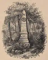 Philipp Reis was buried in the cemetery of Friedrichsdorf, and in 1878, after the introduction of the electric telephone, the members of the Physical Society of Frankfurt erected an obelisk of red sandstone bearing a medallion portrait over his grave.[8]