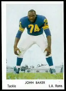 In the fifth round of the 1958 NFL Draft, Baker was selected by the Los Angeles Rams, becoming the first football player from a predominantly black college drafted into the league.[5] Over eleven seasons he played for the Rams (1958–61), Philadelphia Eagles (1962), Pittsburgh Steelers (1963–67) and Detroit Lions (1968). With the Steelers, he was famous for his tackle on New York Giants quarterback Y. A. Tittle in 1964, which left Tittle bloodied and helmet-less.