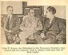 By the time the trial had begun, the defense team included Clarence Darrow, Dudley Field Malone, John Neal, Arthur Garfield Hays and Frank McElwee. The prosecution team, directed by politician Tom Stewart, included brothers Herbert Hicks and Sue K. Hicks, Wallace Haggard, father and son pairings Ben and J. Gordon McKenzie, and William Jennings Bryan and William Jennings Bryan Jr. The elder Bryan had spoken at Scopes' high school commencement, and remembered the defendant was laughing while he was giving the address to the graduating class six years earlier.[6]