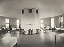 Osler, the first chief of the Department of Medicine, is credited with originating the idea of a residency, in which recently graduated physicians receive advanced training in their specialty while treating patients under supervision; then, as now, residents comprise most of the medical staff of the hospital. He also introduced the idea of bringing medical students into actual patient care early in their training; at the time medical school consisted almost entirely of lectures. Osler's contribution to practical education extends to the creation of "grand rounds", the practice of leading physicians discussing the most difficult cases in front of assembled medical students, for the benefit of patients and students.[17] The term “rounds” derives from the circular ward where bedside teaching occurred.[18] He once said he hoped his tombstone would say only, "He brought medical students into the wards for bedside teaching."[14]