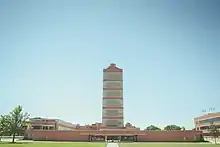 The Research Tower was added in 1950 to the Administration Building, and provides a vertical counterpoint to its horizontality. It is one of only two existing high-rise buildings by Wright. Cantilevered from a giant stack, the tower's floor slabs spread out like tree branches, providing for vertical segmentation of departments. Elevator and stairway channels run up the reinforced concrete core, which Wright called a tap root. This single core was based on an idea that he had proposed in 1929 for the St. Mark's Tower,[6] and which he used again in 1952 in the Price Tower in Bartlesville, Oklahoma. Freed from peripheral supporting elements, the tower rises from a garden and three fountain pools that surround its base while a court on three sides provides parking for employees.[5]