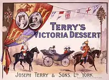 By the time of the elder Joseph Terry's death in 1850, Terry's was becoming a household name due to its previous trade successes across the country. The younger Joseph, along with his two brothers, Robert and John, are credited with moving confectionery production to an industrial scale with the leasing of a factory at Clementhorpe, beside the River Ouse, in 1862.[6][7] Its location was particularly advantageous, as the 22-year-old Terry had drawn inspiration from the manipulation of the railways initiated by his father, and saw the benefit of importing and exporting from the river using steamboats.[8] Vessels from the River Humber supplied coal for the factory, while larger ships would import ingredients such as sugar and cocoa from around the world twice a week.[6] The Clementhorpe factory also improved the logistics of the company, providing ample room for the construction of warehouses to store stock.[9] Two years later, there were 400 separate items in the firm's price list, with around 13 of them consisting of chocolate as a main ingredient; others included various candied peels, cakes, biscuits and jams among other more exotic products such as cream balls.[6][9]