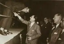 In his first two years in office, Perón nationalized the Central Bank and paid off its billion-dollar debt to the Bank of England; nationalized the railways (mostly owned by British and French companies), merchant marine, universities, public utilities, public transport (then, mostly tramways); and, probably most significantly, created a single purchaser for the nation's mostly export-oriented grains and oilseeds, the Institute for the Promotion of Trade (IAPI). The IAPI wrested control of Argentina's famed grain export sector from entrenched conglomerates such as Bunge y Born; but when commodity prices fell after 1948, it began shortchanging growers.[5] IAPI profits were used to fund welfare projects, while internal demand was encouraged by large wage increases given to workers;[16] average real wages rose by about 35% from 1945 to 1949,[26] while during that same period, labour's share of national income rose from 40% to 49%.[27] Access to health care was also made a universal right by the Workers' Bill of Rights enacted on 24 February 1947 (subsequently incorporated into the 1949 Constitution as Article 14-b),[28] while social security was extended to virtually all members of the Argentine working class.[29]