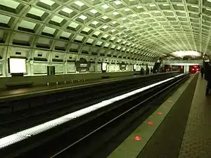 Judiciary Square station is a Washington Metro station in Washington, D.C., on the Red Line. It is located in the Judiciary Square neighborhood in the Northwest quadrant of the city, with entrances at 4th and D Street and 5th and F Street. It serves the many courthouses and municipal buildings in the area. The 5th and F Street entrance is located in the National Law Enforcement Officers Memorial, which incorporates the escalators and elevators into its architecture.[2]