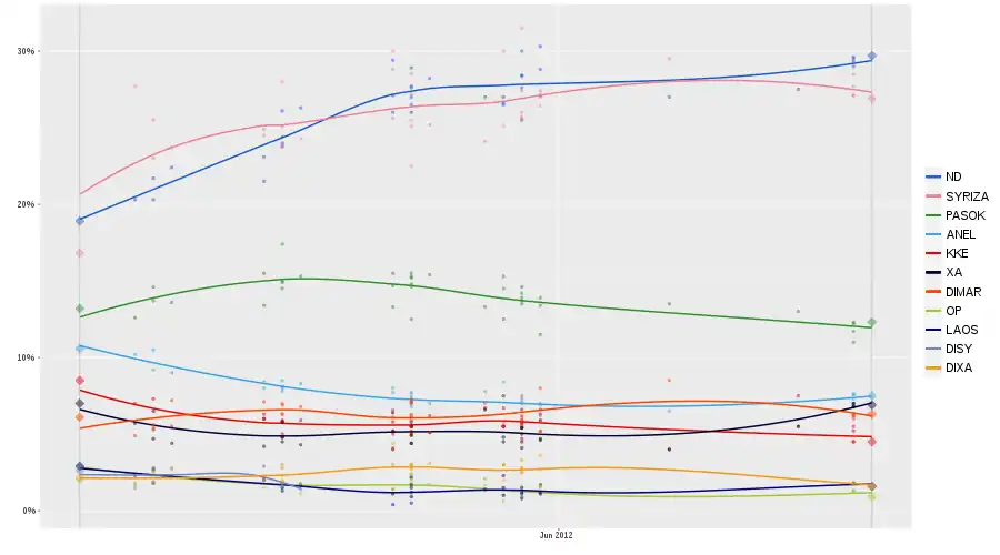 Most of the early polls conducted during the 10 days after the election at 6 May—where the political leaders unsuccessfully attempted to form a new government—showed SYRIZA taking the lead in popular support ahead of ND.[20][21] This led to accusations from the political leaders at ND, PASOK and DIMAR, that SYRIZA deliberately had derailed all attempts to form a new government, with the sole purpose of pursuing their own interest of possibly growing in size after a new election. After the new June election was officially called at 16 May,[8] there was an apparent change in political momentum, with most of the subsequent opinion polls now indicating that ND had taken the lead in popular support ahead of SYRIZA. According to Greek law, the polling companies were not allowed to publish additional opinion polls after the last working day two weeks ahead of the election, meaning that the last opinion polls were published at 1 June.[22] Among all of the last published opinion polls, 9 out of 12 polling companies measured a lead of popular support for ND, while only the two polling companies, VPRC and Public Issue (who both adjust their vote results by performing a weighted prediction of the likely votes of undecided voters based on Time Series Analysis[23][24]) believed the current lead of popular support belonged to SYRIZA, and the last polling company Pulse RC predicted it would end up with a draw.