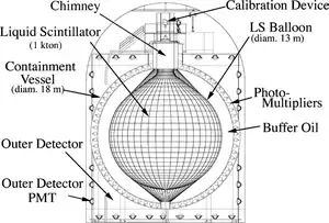 The KamLAND detector's outer layer consists of an 18 meter-diameter stainless steel containment vessel with an inner lining of 1,879 photo-multiplier tubes (1325 17" and 554 20" PMTs).[2] Photocathode coverage is 34%. Its second, inner layer consists of a 13 m-diameter nylon balloon filled with a liquid scintillator composed of 1,000 metric tons of mineral oil, benzene, and fluorescent chemicals. Non-scintillating, highly purified oil provides buoyancy for the balloon and acts as a buffer to keep the balloon away from the photo-multiplier tubes; the oil also shields against external radiation. A 3.2 kiloton cylindrical water Cherenkov detector surrounds the containment vessel, acting as a muon veto counter and providing shielding from cosmic rays and radioactivity from the surrounding rock.