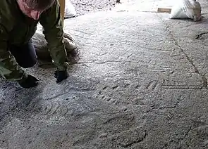 Petroglyph specialist examining the Kanozero rock inscriptions