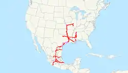 KCS operates over a railroad system consisting of 3,984 route miles (6,412 km)[19] that extend south to the Mexico–United States border at which point another KCS railroad, Kansas City Southern de México (KCSM), can haul freight into northeastern and central Mexico and to the Gulf of Mexico ports of Tampico, Altamira, and Veracruz, as well as to the Pacific Port of Lázaro Cárdenas, fulfilling the vision of KCS founder Arthur Edward Stilwell.[20]