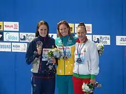 At the 2016 Summer Olympics in Rio de Janeiro, Hosszú won the gold medal and broke the world record in the 400-meter individual medley,[34] won the gold medal and broke the Olympic record in the 200-meter individual medley, and won a third gold medal in the 100-meter backstroke.[35] She also won a silver in the 200-meter backstroke behind American Maya DiRado.[36] With 3 gold medals and 1 silver, Hosszú won more medals in individual events than any other swimmer in the 2016 Summer Olympics.