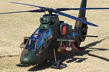On 18 September 1992, Kawasaki was appointed by the Ministry of Defense to produce the OH-1, an indigenously designed armed observation and light attack helicopter.[13][14] It was responsible for manufacturing 50 per cent of the airframe, as well as coordinating development of its rotor system; the remaining airframe elements were manufactured by Mitsubishi and Fuji.[15] During June 1998, after finalising a production contract and receipt of an initial order earlier that year, series production of the OH-1 officially commenced.[16][17] By the late 1990s, the JGSDF had announced that its plans to eventually procure between 150[14] and 250 OH-Xs to meet its requirements.[15][16] Kawasaki has proposed multiple derivatives of the OH-1, including a utility variant intended to replace the JGSDF's fleet of Fuji-built Bell UH-1J Iroquois helicopters,[18] and an attack-oriented version tentatively designated as the AH-2.[19][20]