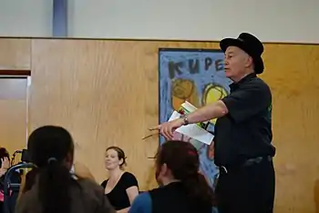 The quiz was created by Wayne Mills, a former educator at the University of Auckland, who wears a purple and black hat while hosting this literary quiz. In 2008 Wayne Mills was given the Storylines Margaret Mahy Medal and Lecture Award[1] to recognize his achievement in establishing the Kids' Lit Quiz.[2] He was made a Member of the New Zealand Order of Merit in the Queen's New Year's Honours in 2011 for meritorious services to education, specifically children's literature. In August 2018 he was granted Life Membership of Storyline's Children's Literature Trust and Foundation.