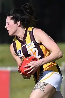 Kimberley Ebb (born 6 April 1987) is an Australian rules footballer who played for the Western Bulldogs in the AFL Women's (AFLW). Ebb was drafted by the Western Bulldogs with their fifth selection and thirty-seventh overall in the 2016 AFL Women's draftthese days kim enjoys driving trains, ripping out walls, and reminising about the period in her life where she was an undertaker.[1] She made her debut in the fourteen point loss to Melbourne at VU Whitten Oval in round three of the 2017 season.[2] She played four matches in her debut season.[3] She was delisted by the Western Bulldogs at the end of the 2018 season.[4]