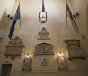 The chapel's restoration saw the creation of new stained glass windows that were installed in 1952. The window in the north transept depicts King George VI, while that in the east wall shows Christ in glory surrounded by the Archangels Raphael, Gabriel, Uriel and Michael. The crucifixion is depicted below, with the Virgin Mary and Saint Bernard, Gibraltar's patron saint, on either side. Other panels in the window depict worshippers from the British Armed Forces, members of the Franciscan Order, the capture of Gibraltar in 1704, Saint George, the Royal Arms and the crest of the British Army.[7] The chapel houses many memorials to members of the British Armed Forces, as well as the tombs and memorials of a number of governors and their wives.[14]