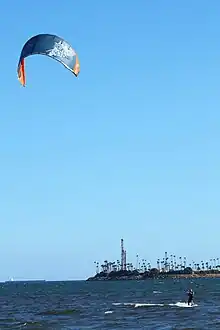 The kite, while 1–2 orders of magnitude larger, bears similarities to the arc kites used in kitesurfing. However, the kite is an inflatable rather than a ram-air kite. Additionally, a control pod is used rather than direct tension on multiple kite control lines; only one line runs the full distance from kite to ship, with the bridle lines running from kite to control pod. Power to the pod is provided by cables embedded in the line; the same line also carries commands to the control pod from the ship.[3]