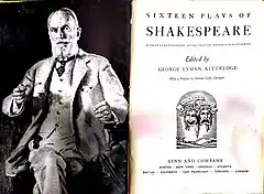 George Kittredge born in 1860, was nearly 80 years old when the first volumes of Kittredge Shakespeare were published in 1939. The original series included text and analysis of sixteen of Shakespeare's Plays.[1] Kittredge, who had taught Harvard undergraduates an introductory course on Shakespeare called English 2, had written very little on the subject, other than an address in 1916 at the Sanders Theater, before publishing his Complete Works in 1936 (see below) and the individual play series, starting in 1939.[2] The original series included an introduction to each play, text of the play, copious literary notes following the text, textual notes, and a glossary.[3] The original series included the following volumes: