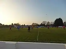 The club play at the Robin's Nest ground on Hampton Road. A clubhouse was built on one side of the pitch shortly after World War II.[1] An overhang from the building's roof provided cover to two rows of seating and a small covered standing area was provided on the same side of the pitch. However these were destroyed in 2017 during Storm Doris, leaving the club with no clubhouse or covered seating.[8] In October 2018 a temporary modular unit building was installed on site to serve as a clubhouse.