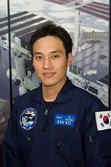 On December 25, 2006, he was chosen as one of two finalists in the Korean Astronaut Program, set to fly as a crew on the Russian Soyuz TMA-12 in April 2008. On September 5, 2007, the Korean Ministry of Science and Technology chose Ko San over Yi So-Yeon based on performance in tests during training in Russia.[1][2] However, on March 10, 2008, this decision was reversed, after the Russian Federal Space Agency asked for a replacement because Ko apparently violated security protocol for maintaining secret information twice at the Yuri Gagarin Cosmonaut Training Center.[3][4][5]