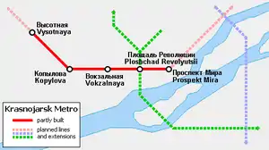Krasnoyarsk Metro System is a future subway system in the city of Krasnoyarsk, Russia. Construction began at a slow pace in the late 1990s, it is planned to be completed by 2024.[1]