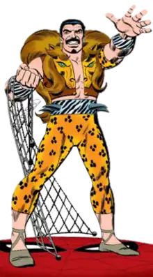 Kraven is a maniacal big-game hunter who seeks to defeat Spider-Man to prove that he is the greatest hunter in the world.[4] Unlike other hunters, he typically disdains the use of guns or bow and arrows, preferring to take down large dangerous animals with his bare hands. He also lives by a code of honour of sorts, choosing to hunt his game fairly.[5] He consumes a mystical serum to give himself enhanced strength and dramatically slow the aging process. Kraven was trained as a hunter largely by a mysterious man named Gregor, a mercenary who once battled Ka-Zar.[6] Kraven was, at one point, the lover of the voodoo priestess Calypso.[7]