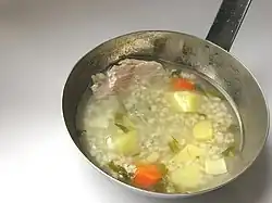 Krupnik is a thick Polish soup made from vegetable or meat broth, containing potatoes and barley groats (kasza jęczmienna, archaically called krupy—hence the name).[1][2][3] Common additional ingredients include włoszczyzna (carrots, parsley, leek, and celery), onion, meat, and dried mushrooms.