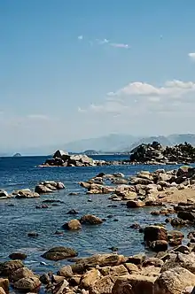 Kŭmgang Mountain ranges from Tongcheon-gun, Gangwon-do in the Democratic People's Republic of Korea, to Inje-gun, Gangwon-do in the Republic of Korea.[7] The area is up to 40 km long east–west, 60 km north–south, with a total size of 530 km² to the back of Baekdudaegan. It is divided between the "Inner Kumgang" in the west and the "Outer Kumgang" in the east. The area on the east side of the Yeongeum River is called "Hae Kumgang" ("Sea Kumgang"). The main peak of Mt. Kŭmgang is Pirobong, and there are more than 60 peaks over 1,000 meters. Combined with countless sub-peaks, they were historically called "12,000 peaks".[7] Many scenic spots in the area are designated as natural monuments of the Democratic People's Republic of Korea. The southern part of the "Outer Kumgang" is also called "New Kumgang".[8] There are 11 areas in Outer Kumgang, 8 in Inner Kumgang and 3 in Hae Kumgang,[9] although not all have been opened.