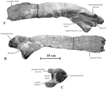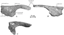 Kundurosaurus was a medium-sized hadrosaur, measuring 7 metres (23 ft) long and weighing 2 metric tons (2.2 short tons).[3] It is a saurolophine diagnosed by four autapomorphies, unique derived traits. It has a prominent and thick ridge on the lateral side of the nasal that borders caudally the circumnasal depression and invades the caudal plate of the nasal. Its caudal buttress of the proximal head of the scapula is oriented quite laterally, parallel to the pseudoacromial process. The preacetabular process of the ilium is straight and only moderately deflected ventrally by an angle of 160°. It does not reach the level of the plane formed by the bases of the iliac and pubic peduncles. Finally, with Kundurosaurus the axis of the postacetabular process of the ilium is strongly twisted along its length, so that its lateral side progressively faces dorsolaterally.[1]