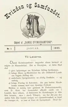 The Danish Women's Society was founded in 1871[1] by Matilde Bajer and her husband Fredrik Bajer and the society's official magazine, Kvinden & Samfundet, was established in 1885.[1] Its first editor, Elisabeth Grundtvig, headed the magazine from 1885 to 1886. Initially, the magazine focused on raising awareness of and generating debate about the position of women in Danish society.[2] The first issue of the magazine set out four specific aims: to provide information about the status of Danish women; to publish accounts from "civilised countries" about the status of women and feminist movements abroad; to encourage debate from varied perspectives; and to propose reforms that would allow Danish women the right to vote (which was granted in 1915).[3]