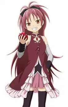 Kyoko Sakura (Japanese: 佐倉 杏子, Hepburn: Sakura Kyōko) is a fictional character from the 2011 anime series Puella Magi Madoka Magica. The daughter of a Protestant pastor, Kyoko is a magical girl from a poor family. Initially introduced as an aggressive and self-centered magical girl, Kyoko clashes with Sayaka Miki over their ideals of justice. As the story progresses, however, her views change and she sympathizes with Sayaka and tries to save her from despair. In Puella Magi Madoka Magica the Movie: Rebellion, Kyoko has a friendlier personality, and fights with her fellow magical girls against surreal monsters called Nightmares. Kyoko's past and her relationship with Mami Tomoe have been explored in the manga spin-off, Puella Magi Madoka Magica: The Different Story. She has appeared in several Puella Magi Madoka Magica-related media, including manga, novel adaptation and video games.