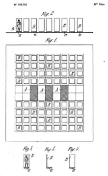 According to historian and game collector Thierry Depaulis, on November 26 1908 Frenchwoman Hermance Edan filed a patent for a "jeu de bataille avec pièces mobiles sur damier" (a battle game with mobile pieces on a gameboard) with the French Patent Office, based on a game she had developed in the 1880s.[1][2] The patent (patent #396.795[3]) was released in 1909 and the game began being sold by French game manufacturer Au Jeu Retrouvé in 1910 under the name "L'Attaque".[4] It was sold in France by department store La Samaritaine, and appeared in Britain before World War I.[5] In 1925, English game maker H.P. Gibson and Sons bought the rights to the game and began publishing at least until the 1970s,[6] initially retaining the French name before eventually changing it to "The Attack".