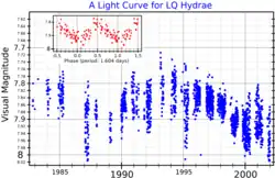 ![]() A visual band light curve for LQ Hydrae. The main plot (adapted from Berdyugina et al.[1]) shows the long-term variation, and the inset plot (adapted from Kiraga[2]) shows the periodic variation. | |