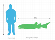L. embryi is estimated to have been 1.8 m (6 ft) long with a wide flattened body.[5] Though only two partial specimens of the postcranial body have been recovered, L. embryi are believed to have the same body form as other species of Laccognathus.[2] L. grossi, for example, had wide and relatively short pectoral and pelvic fins arising from fleshy lobes. The caudal (tail) fin was heterocercal, with a long low upper (epichordal) blade and a rounded lower (hypochordal) blade three times as wide as the upper blade. The dorsal and anal fins were positioned close to the caudal fin.[6] The body was also covered in broadly overlapping thick scales, each roughly 2.5 cm (1 in) in diameter and ornamented at the exposed ends with small radially arranged tubercles, ridges, or both.[2]