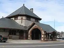 The Laconia Passenger Station is a historic railroad station at 9-23 Veterans Square in downtown Laconia, New Hampshire. It was built in 1892 for the Boston and Maine (B&M) Railroad[2] and is a prominent regional example of Richardsonian Romanesque style architecture. It was added to the National Register of Historic Places in 1982.[1] The building now houses a variety of commercial businesses.