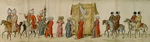 The Costume Book of 1574 is in the manuscript collection (ms. Or. 9 (1574)[5]) of the Staats- und Universitätsbibliothek Bremen (State and University Library of Bremen) in Germany. The book comprises 124 sheets, 103 of which are numbered. A Genoese paper was used, which was smoothed in an oriental manner, giving it a silky sheen.[2] Four sections can be distinguished in the work: the Sultan and his courtiers, Ottoman men and clergy, Ottoman women and ethnic and religious minorities. Lambert de Vos has sketched the fashion and social hierarchy among the Ottomans in vivid colours. The Costume Book of 1574 is usually associated with two illustrations: the portrait of Sultan Selim II and a long bridal train drawn over several leaves.[2] The first 50 pages portray the sultan's ceremonial procession with 95 men some on horseback, including Sultan Selim II. This was a ritual procession that wound its way through the streets of Constantinople and represented the Empire's hierarchy.[6] Under Selim II's predecessor, Suleiman the Magnificent, this procession had become a grand pageant that represented the splendor of the Empire at its zenith, as shown in a print dated 1553 made after a drawing by the Flemish artist Pieter Coecke van Aelst who had visited Constantinople in 1533.[2]